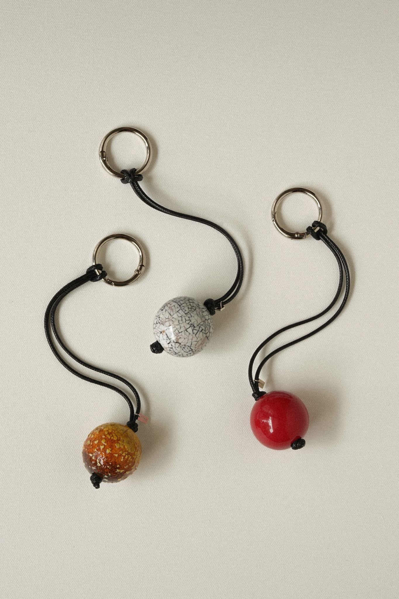 Look closely and you will see pieces of real eggshell. On the black charm, they have been sanded many times until smooth to the touch. On the yellow one, they are sanded fewer times, so their texture still lingers under your fingers.